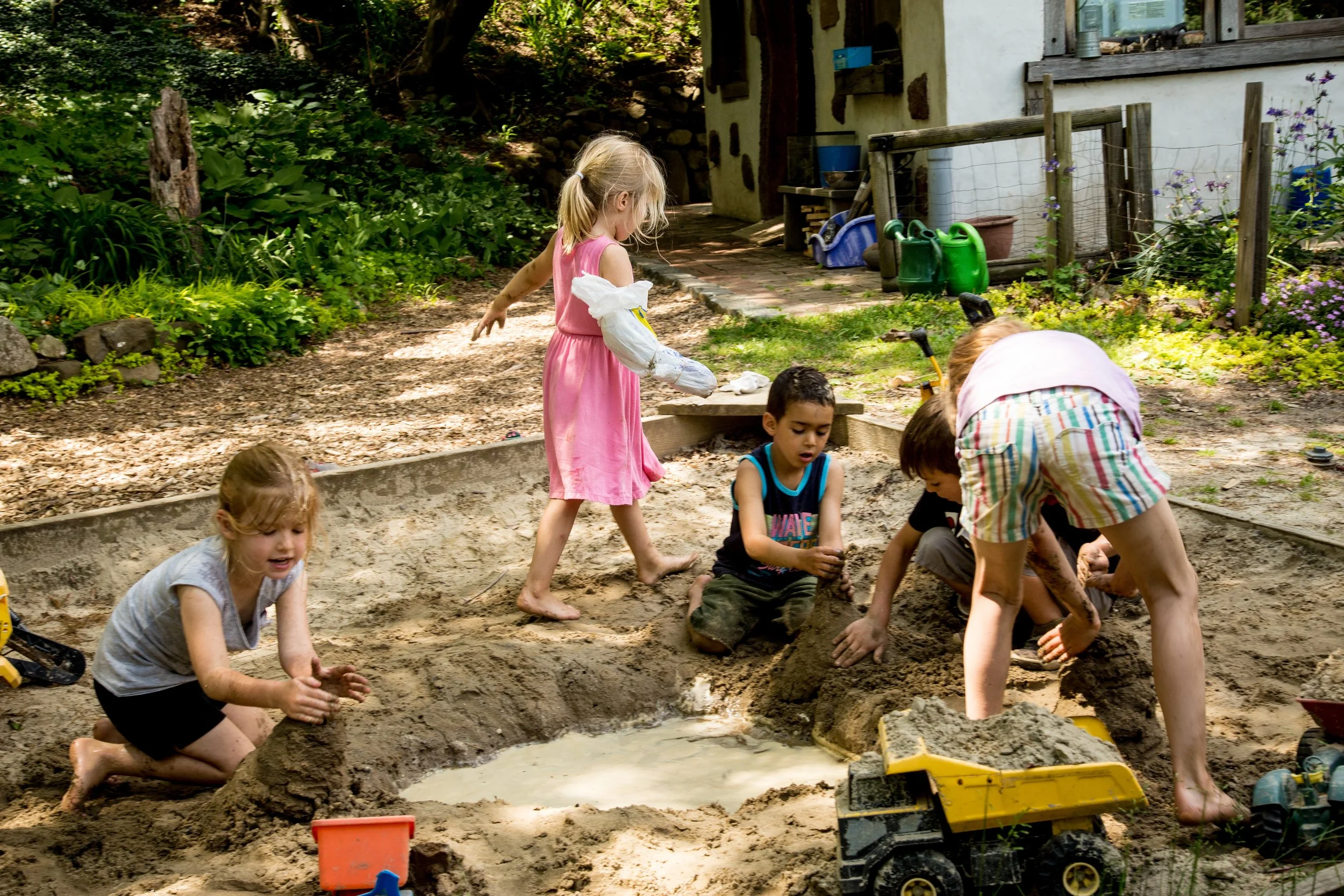 is organized in such a way that, periods of free play alternate with periods of focused activity. We encourage learning through play because our intention is to nourish the children’s natural curiosity and innate desire to learn. We strive to help the children develop the confidence and security needed to take risks in thoughts and experiences that lead to new understandings. We do this by engaging the whole child – mind, body and feelings. Learning to work together and to listen and respect each other are important parts of the social learning that happens while children negotiate decisions on the playground, help each other in “circle,” partner during directed activities as well as in the unstructured play. It is in unstructured play where so much important learning is done.